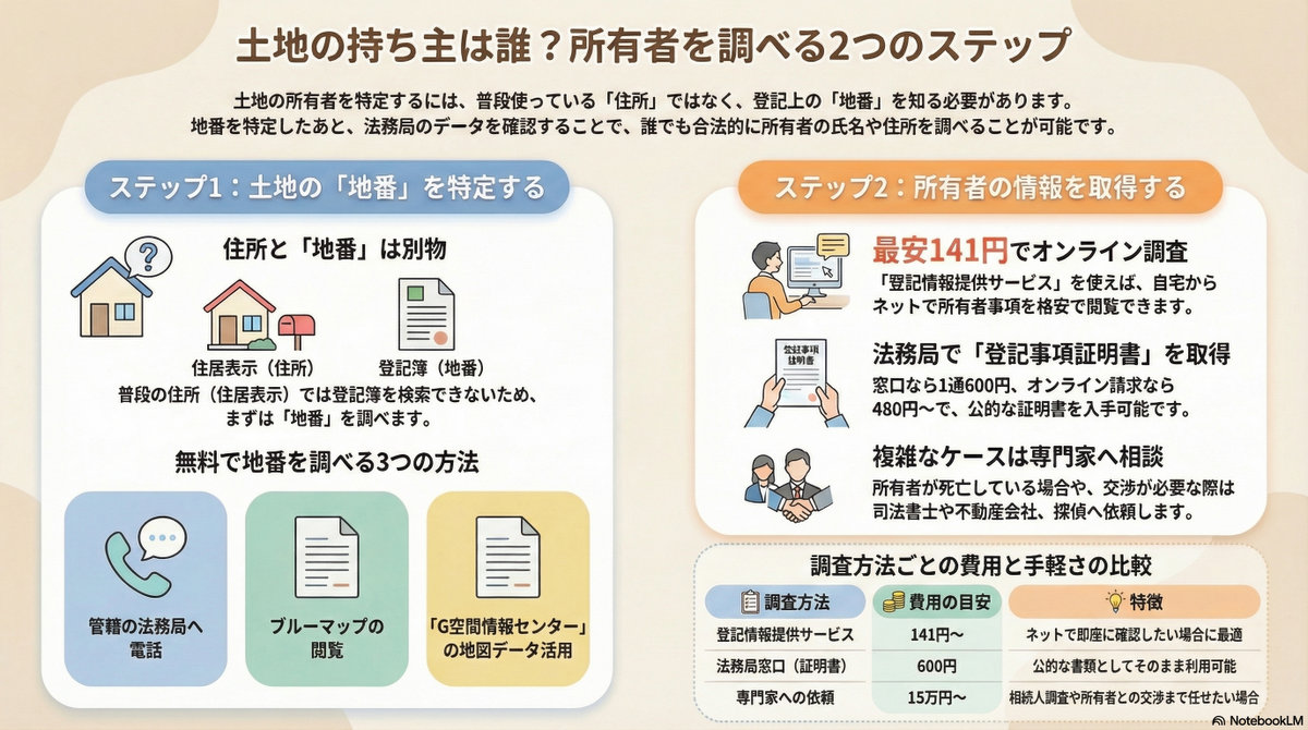 この「情報の入り口」でつまずくことが所有者特定における最大のハードルです。