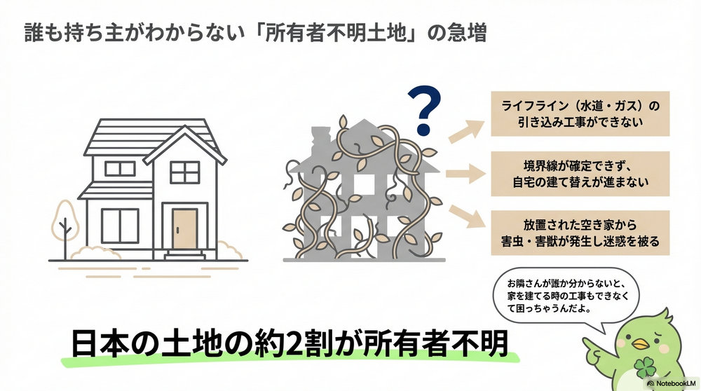 現代の日本において、不動産は「静的な資産」から「動的な管理リスク」へとその性質を変貌させています。その最たる課題が、登記簿上の住所に連絡がつかない、あるいは相続が数代にわたって放置された「所有者不明土地」の問題です。近所の空き地が誰のものかわからない、あるいは数代にわたる相続を放置してしまい、権利関係が糸のように絡まり合っている現状です。