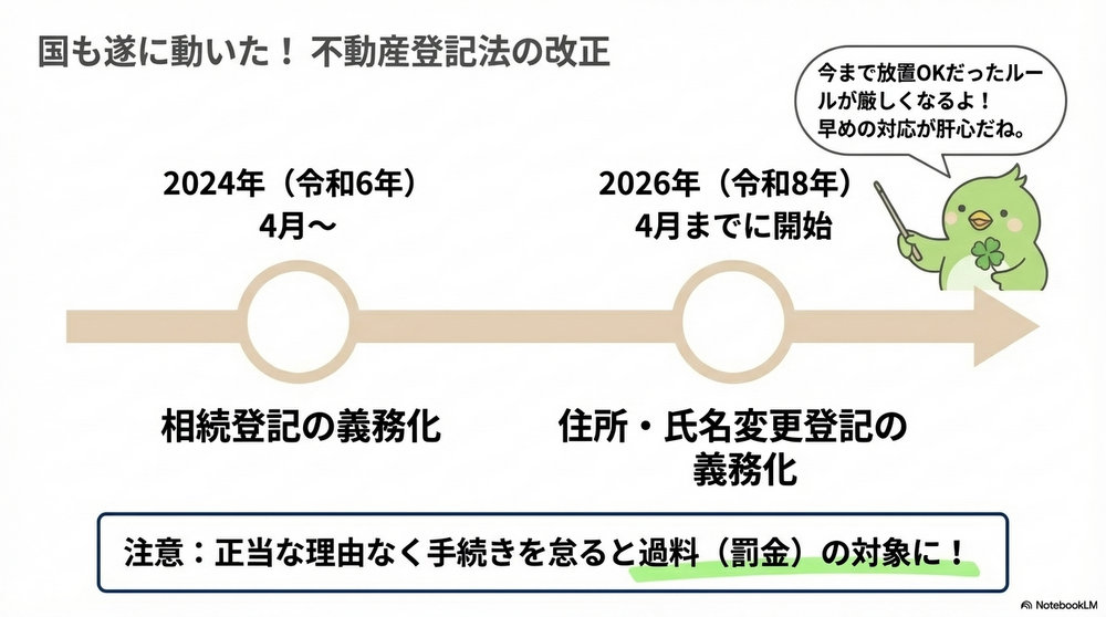 こうした「沈黙する土地(所有者不明の土地)」の増大は、経済活動を阻害する深刻な法的障壁となっています。しかし今、2024年および2026年の法改正という転換点を迎え、「個人の裁量」で放置できた時代は終わりを告げました。