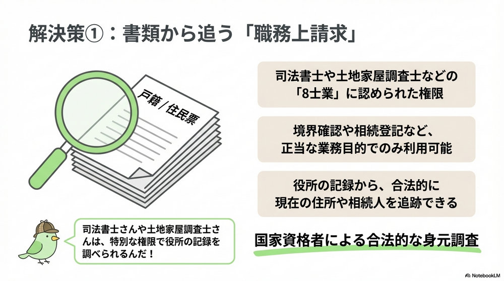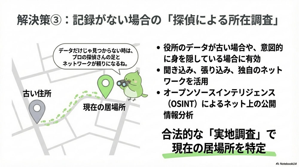 もし所有者が引っ越し後に登記を変更せず、デジタルの足跡が途切れてしまった場合、そこからはプロによる「多重レイヤーの調査戦略」が必要になります。