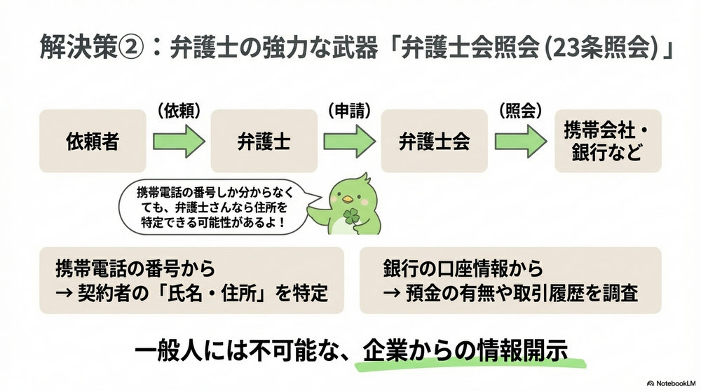 - 弁護士の優位性: 2020年の法改正以降、大手銀行等の情報開示率が向上して金融機関を通じた所在特定がやりやすい。