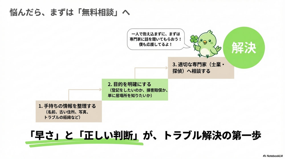 - 探偵の費用対効果: 所在調査の相場は10万〜50万円ほどだが、これは「法的デッドロック」を解除して数百万〜数千万円の資産価値を回復させるための「防衛的投資」とも考えられる。