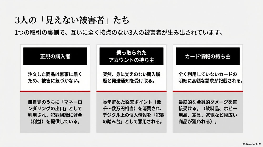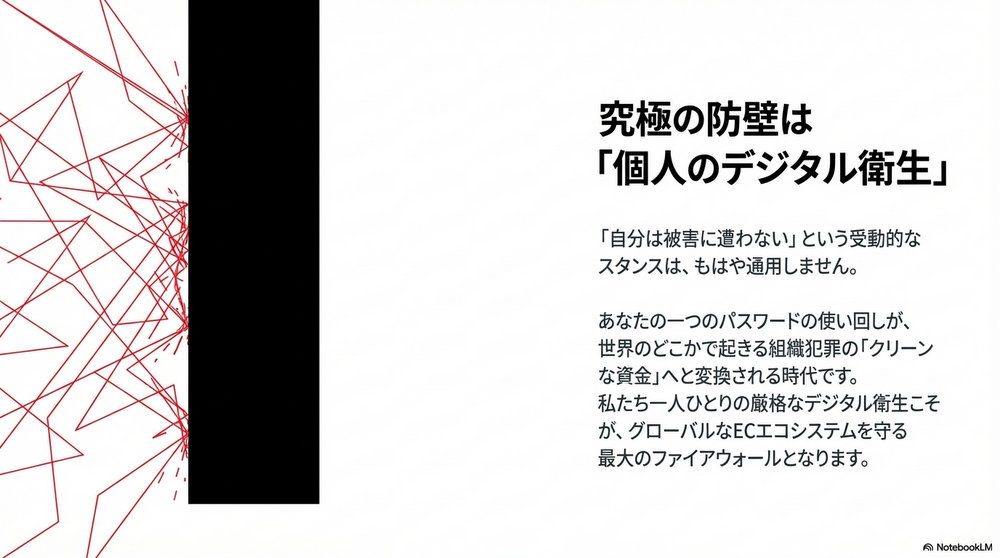 今回明らかになった一連の事件は、単なる「運の悪い誰か」の物語ではありません。ネット社会の構造的な隙間を突き、善意の購入者と無防備なアカウント保持者の両方を巻き込む、高度にシステム化された犯罪です。私たちが享受している「安くて便利なネットショッピング」という恩恵の裏には、常に「セキュリティの維持」という不可避なコストが存在します。そのコストを支払うことを怠ったとき、私たちは被害者になるだけでなく、知らぬ間に犯罪組織の「共犯者」へと仕立て上げられてしまうのです。あなたが手にしたその「15%お得な商品」は、本当に正当な取引の結果でしょうか?