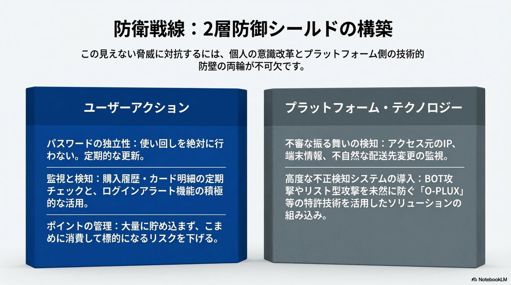 • 大量のポイントを保持することは、犯人にとっての「期待利益」を高めることと同義です。こまめに消費することで、万が一の際の損失(アタック・サーフェス)を最小限に抑えましょう。