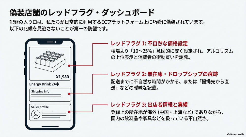 その理由は、データに裏打ちされた精密な価格設定にあります。不正な出品を行っている店舗は、商品を一般の市場相場よりも10〜25%ほど安く設定していました。「50%オフ」のような極端な値引きは警戒心を煽りますが、「15%程度安い」という設定は消費者に「ポイント還元やセールの一環だろう」という誤った納得感を与えてしまいます。「少しでも安く買いたい」という消費者の正当な心理が、結果として犯罪組織に利益(無在庫転売の代金)をもたらし見知らぬ誰かの資産を奪う構造を支えてしまっているのです。