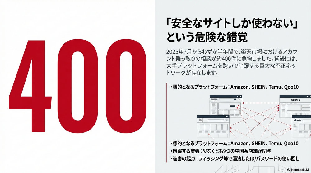 警視庁サイバー犯罪対策課の発表によれば、2025年7月からの半年間で、大手通販サイト「楽天市場」のアカウントが乗っ取られて他人の名義で商品が不正購入される被害相談が約400件も寄せられています。この数字は氷山の一角に過ぎません。なぜなら、この犯罪は「商品が注文通りに手元に届く」という極めて奇妙な性質を持っているため、被害の発覚が大幅に遅れる構造になっているからです。
