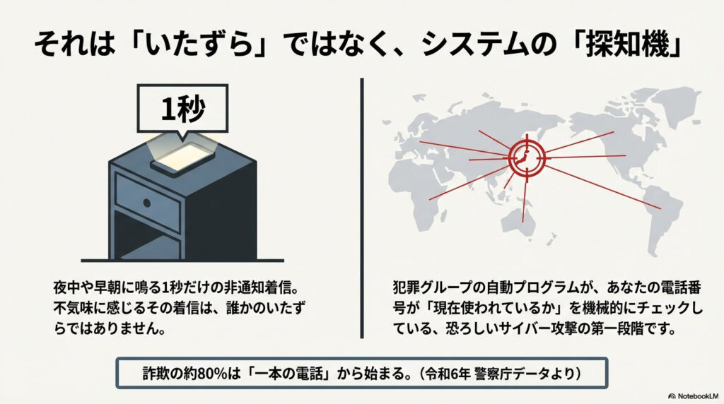 寝静まった深夜2時。あるいは翌朝、スマートフォンの画面に残された「非通知設定」の着信履歴。それを見た瞬間の独特の不気味さを経験したことはないでしょうか?「ただのイタズラだろう」「間違い電話だろう」と、多くの人が見過ごしてしまいがちなこの「ワンギリ」には、現代の巧妙なサイバー犯罪や特殊詐欺の巧妙な「足掛かり」が隠されています。