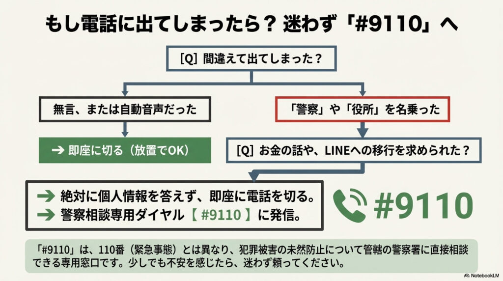 不安を感じた際の相談窓口があります!不審な電話に出てしまい少しでも不安を感じた場合は、迷わず警察相談専用ダイヤル「#9110」へ連絡してください。