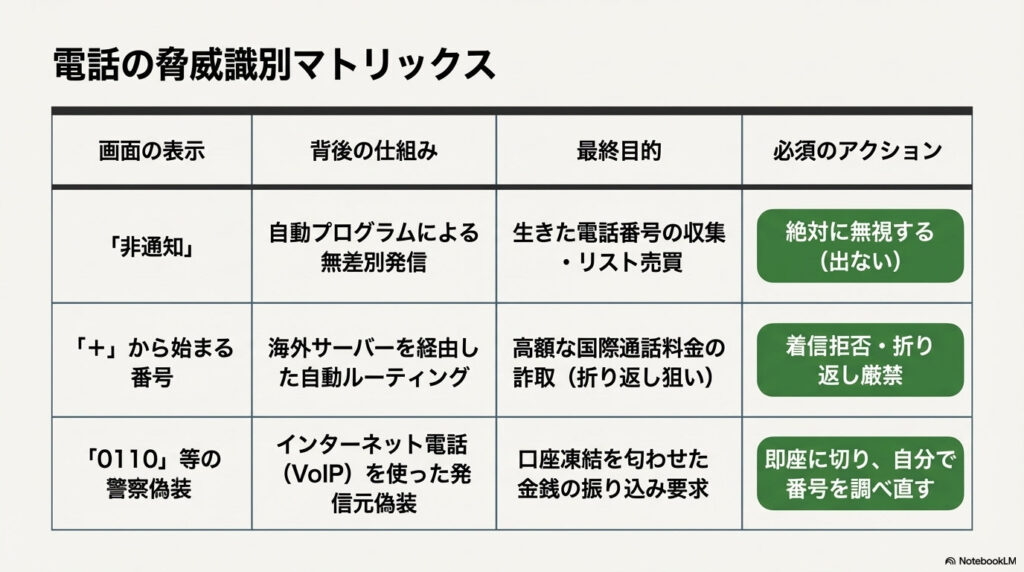 もし心当たりのない着信に出る場合は、以下の動作を徹底してください。