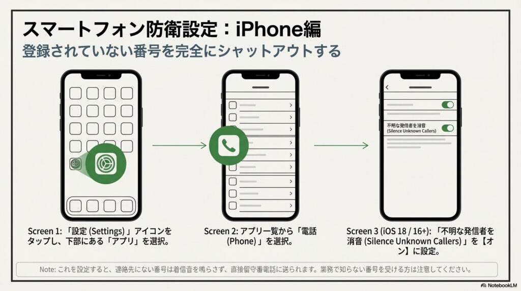 • iPhoneの場合: 「設定」>「アプリ」>「電話」>「不明な発信者を消音」をオンにします。
