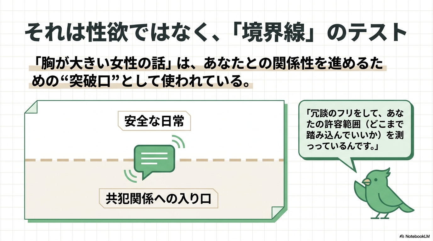 性的な話題に持ち込むための安全な導入としてのジャブ、距離を縮めるための助走です。この手法の巧妙さはその「グレーさ」にあります。もし相手に不快な顔をされても「冗談だよ」という逃げ道が確保されているのです。この確認作業こそが境界線のテストです。拒まれたら「冗談だよ」で引ける。受け入れられたら、次の一歩に進める。この種の話題は欲望の告白ではなく、侵入可能な距離を測るための試金石として機能しているのです。
