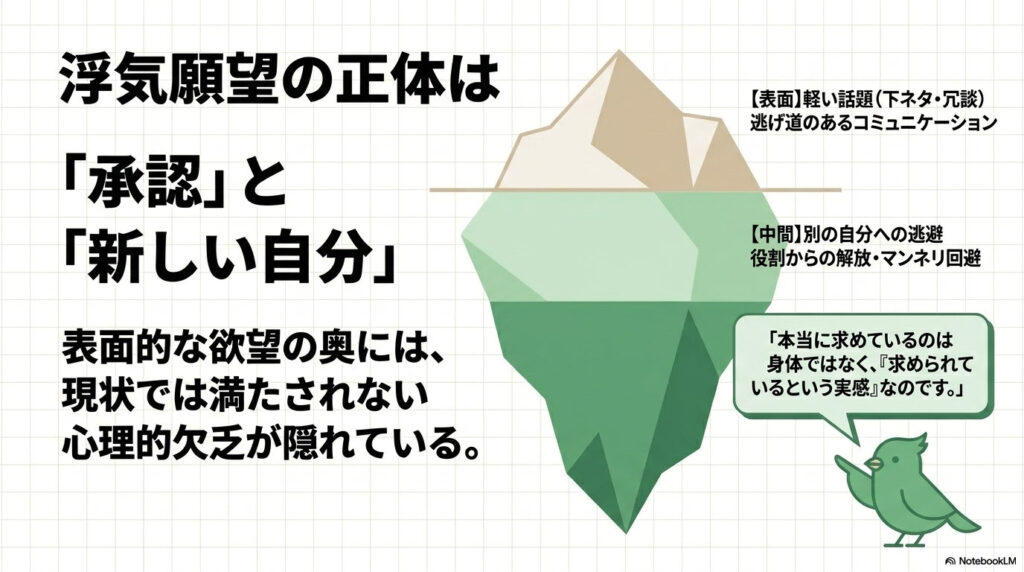 そうやってちゃんとした自分を演じている人ほど、どこかで雑で、下品で、未完成な欲望を肯定してくれる相手を探すことがあります。だから彼らは性的な話題で盛り上がれる相手を見つけると「この人なら、自分の本音を否定しない」と感じやすいのです。そこで起きているのは性欲の爆発というより、承認欲求の救済です。―― いえ、性欲の爆発です。本命のパートナーとの関係において、人は無意識に「品位」や「良き夫・妻」としての役割を演じようとします。その反動として、パートナーには見せられない「雑な欲望」を共有できる相手を無意識に探してしまうのです。自分の心の「隙間」を埋めてくれるという感覚なのかもしれません。
