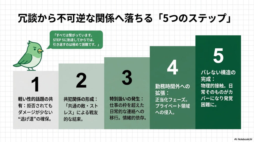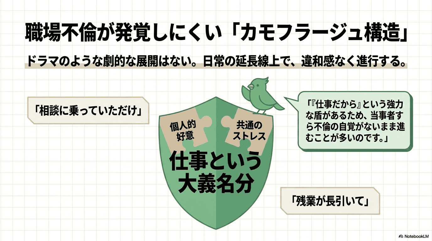 職場不倫が恐ろしいのは、それが「日常の延長線上」で不可逆的に進行する点にあります。