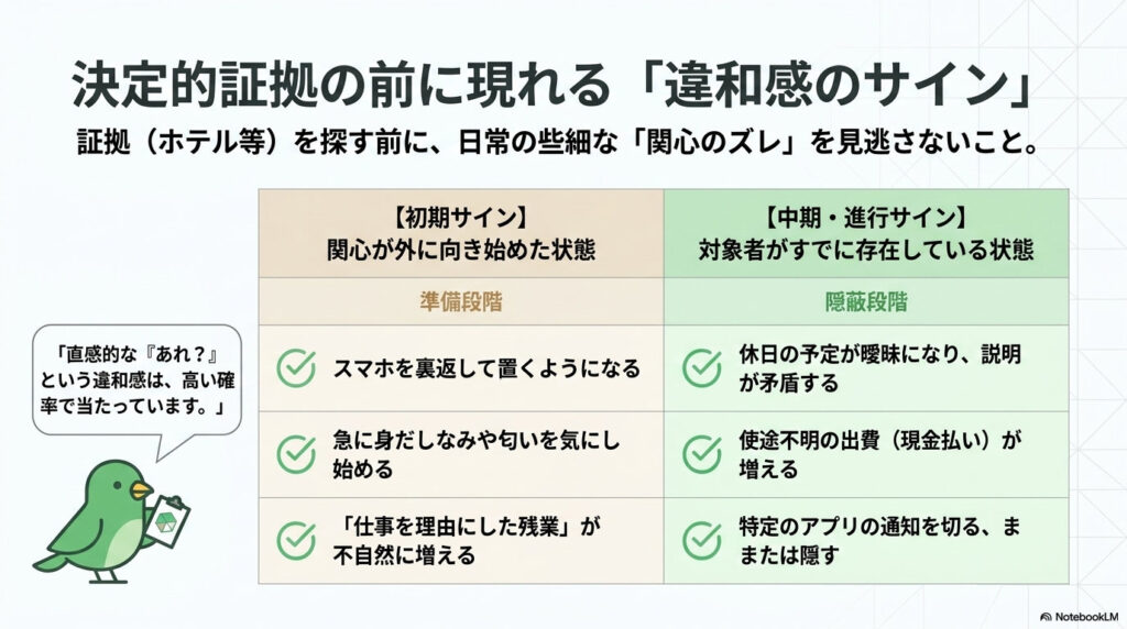 探偵が見るのは「怪しいかどうか」ではなく行動変化がどれだけ連続しているかです。浮気の芽は、いつも言葉の温度と行動のリズムの変化が先に出ます。