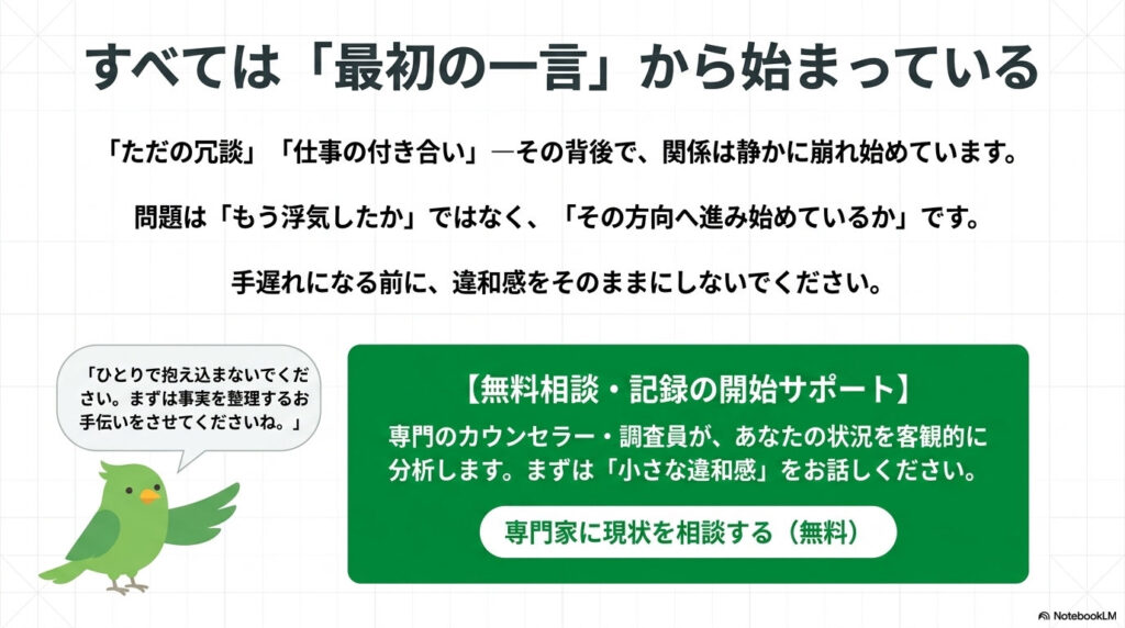 ここまで来ると、最初の一言は「ただの冗談だった」はずなのに現実はもう冗談では済みません。我々の浮気調査を扱うこの目には、関係が始まる瞬間よりもその前に積み上がった言い訳の階段の方がはっきりと見えます。